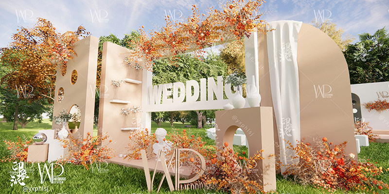 香槟白秋天户外草坪婚礼效果图平面素材KT源文件设计策划方案热门设计联盟服务商