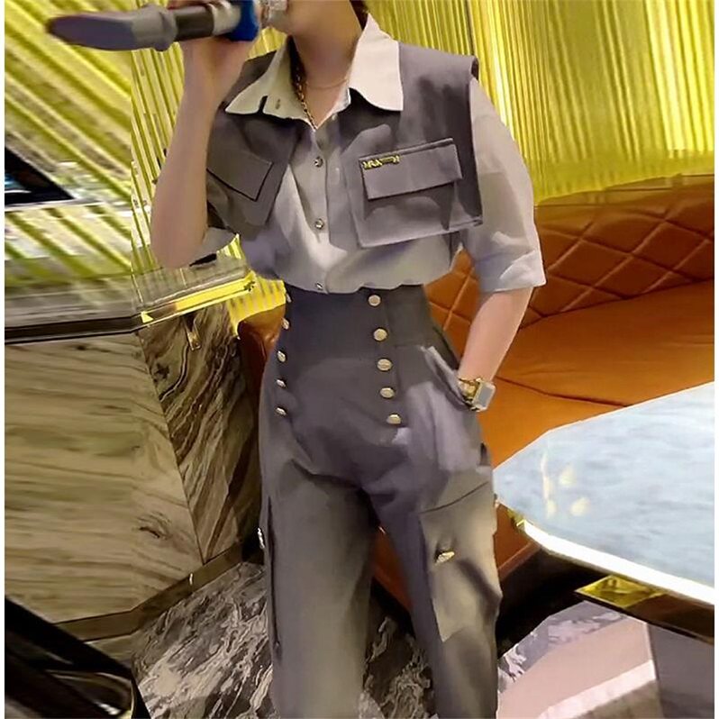 欧洲站2021夏欧货时髦洋气设计感马甲衬衫双排扣束脚工装裤套装女热门设计联盟服务商