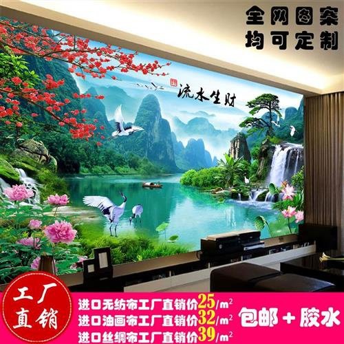 影视墙壁画流水生财客厅电视背景墙纸风景瀑布迎客W松沙发整张。热门设计联盟服务商