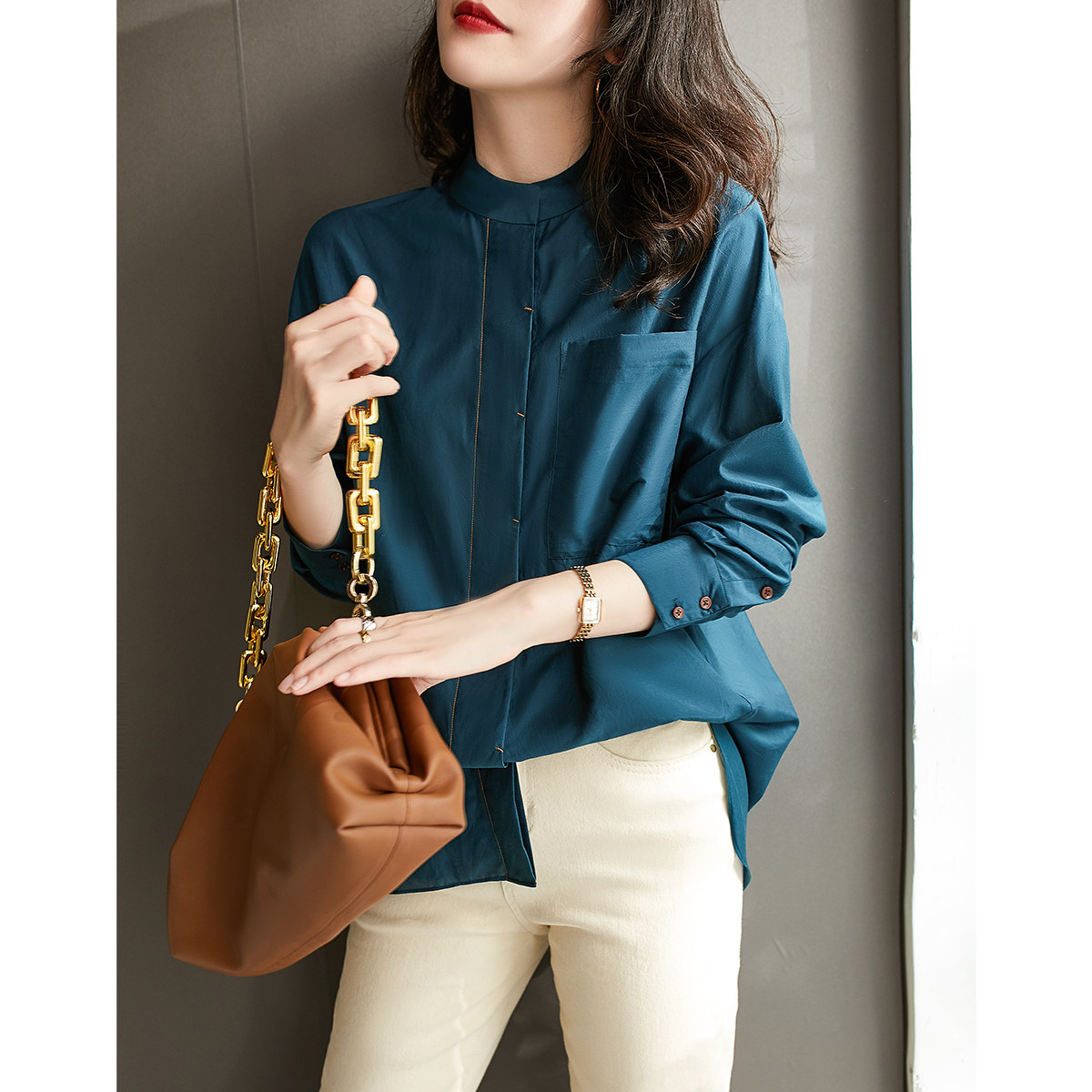 [CY222320AG]好温柔深湖绿衬肤白设计感小众大口袋蓝色衬衫女士热门设计联盟服务商